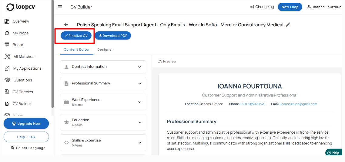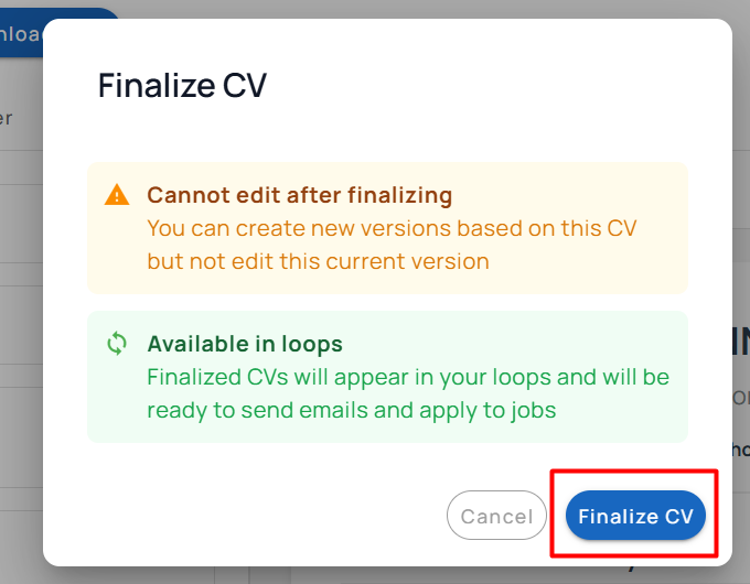 Click the Finalize CV button. Once finalized, your CV will be added to your available CVs.