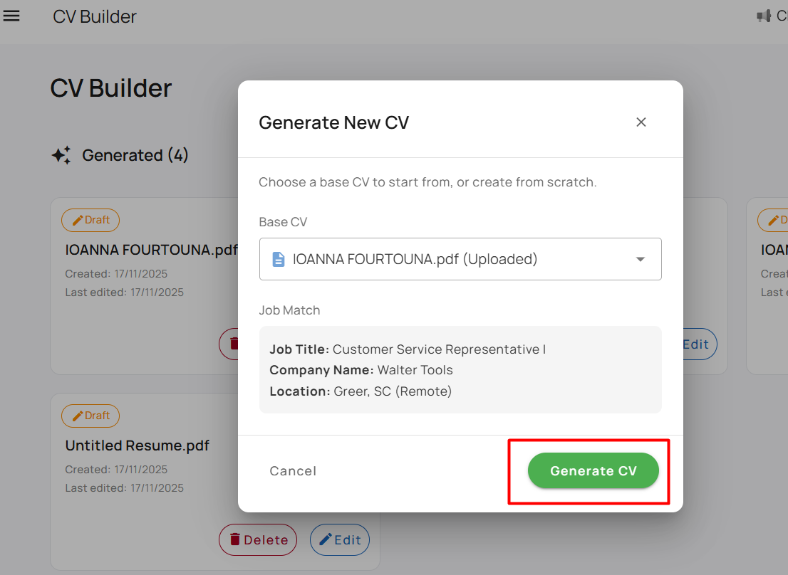 4. Select your CV, and click “Generate CV”.