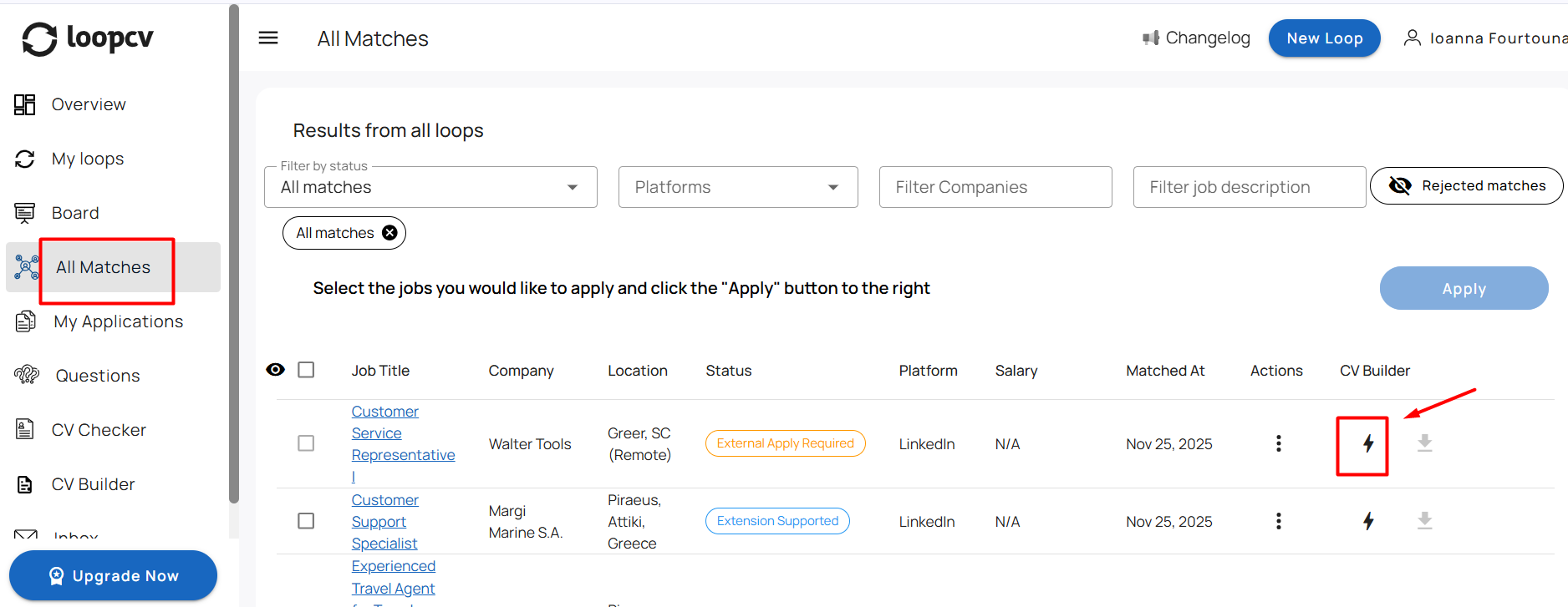 Click the lightning icon next to the job match you want to tailor your CV for.