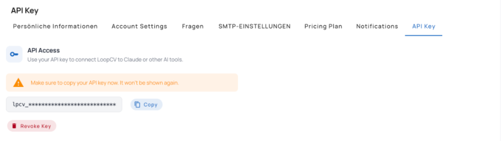 No. For security reasons, LoopCV only shows the full key once - right after it is generated. After that, only a masked version (e.g. lpcv_••••••••••••••••abc123) is displayed. If you lose your key, you will need to revoke it and generate a new one.