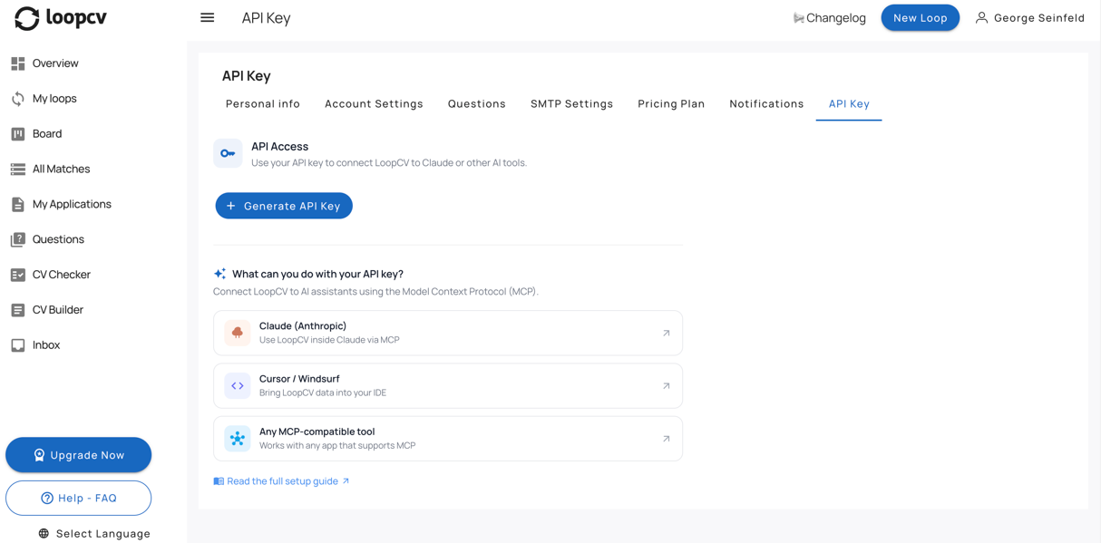 The key grants read access to your job matches, loops, and profile data. It does not allow changing your password, billing information, or account email.
