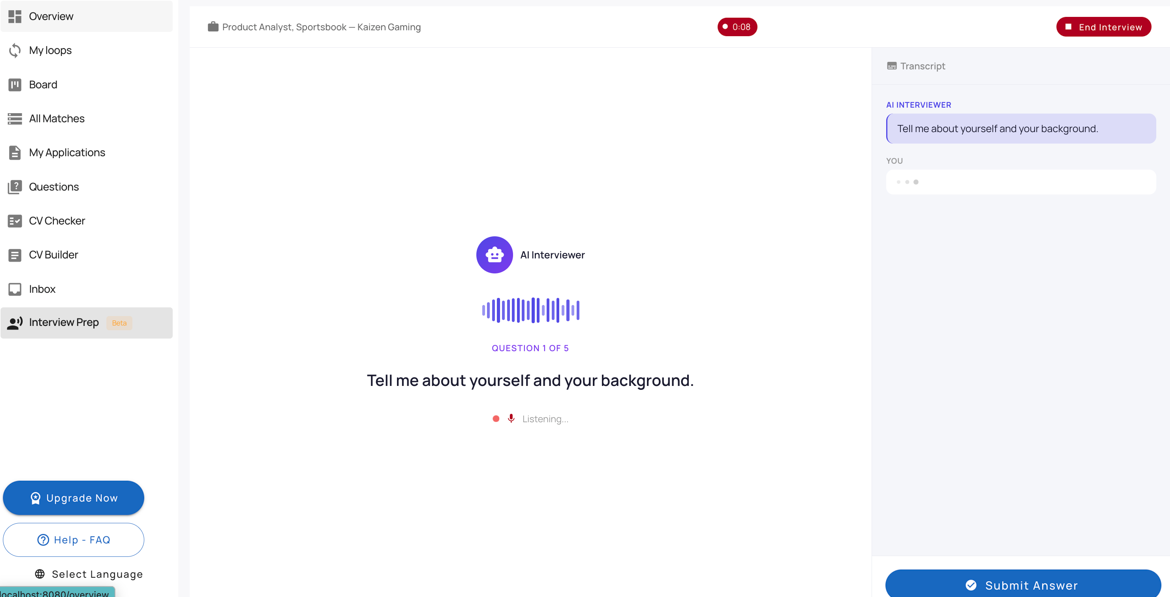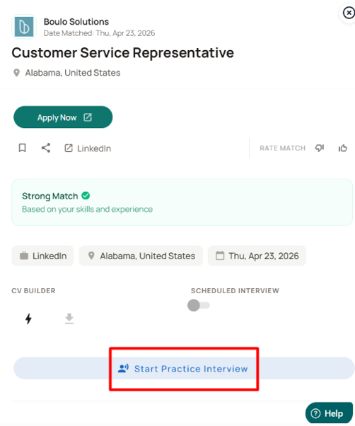 For example, if you open a Product Analyst match and click Start Practice Interview, your session will be based on that job opportunity.