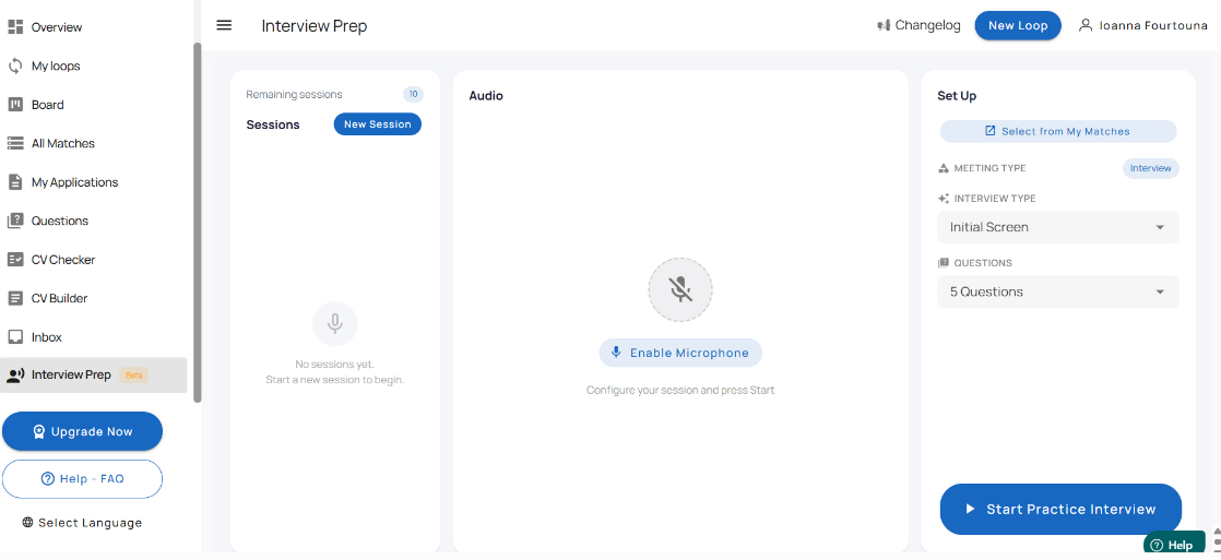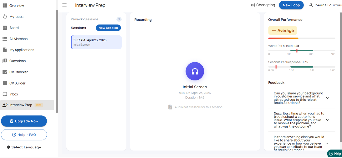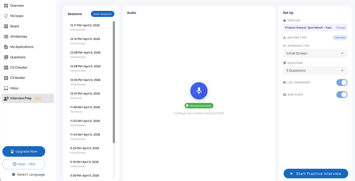 Yes. The Interview Prep page includes a Sessions section where you can view previous practice sessions.